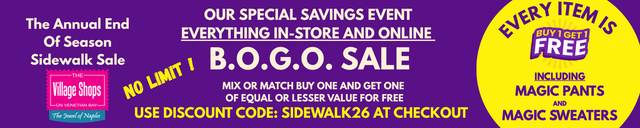 During The Annual Village Sidewalk Sale! For Each Item Purchased, Get Another One OF Equal OR Lesser Value For Free; On Top Of Any Already Discounted Prices, No Limit! THIS OFFER IS ONLY GOOD BETWEEN APRIL 16-19 ONLY!