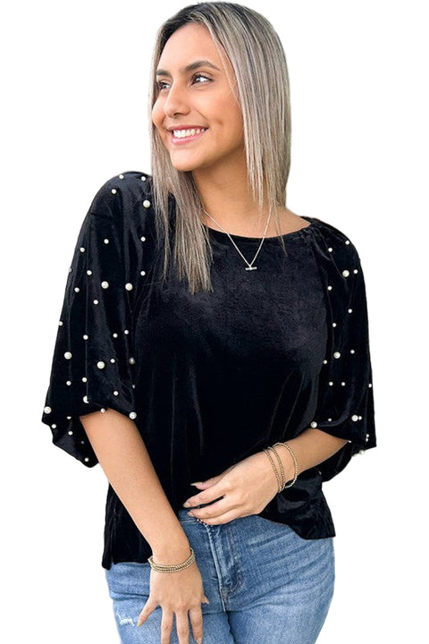 Add a dash of sparkle to your wardrobe with the Black Pearl Beaded Half Sleeve Velvet Top. This playful velvet piece features delicate pearl bead detailing that catches the light just right. With cozy fabric and chic half sleeves, it’s perfect for turning heads and brightening your day or night in style.