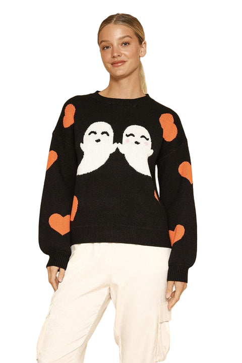 Get ready for Halloween fun with this playful cotton sweater featuring charming ghost and heart prints. The long sleeves and classic crew neck offer cozy comfort, making it perfect for festive fall days or casual outings. Lightweight yet warm, this sweater is an adorable way to celebrate the season with a touch of spooky sweetness.