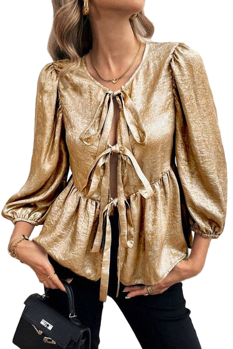 Bow Tie Front Puff 3/4 Sleeve Ruffle Hem Blouse