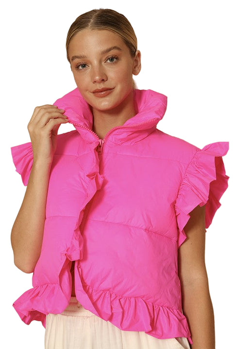 Add a pop of fun to your outerwear with this Cropped Ruffle Puffer Vest in vibrant hot pink. Crafted to keep you cozy without bulk, its playful ruffle detail adds a flirty twist to chilly days. Perfect for layering over your favorite tops, this vest combines warmth and style in a bold, eye-catching shade.
