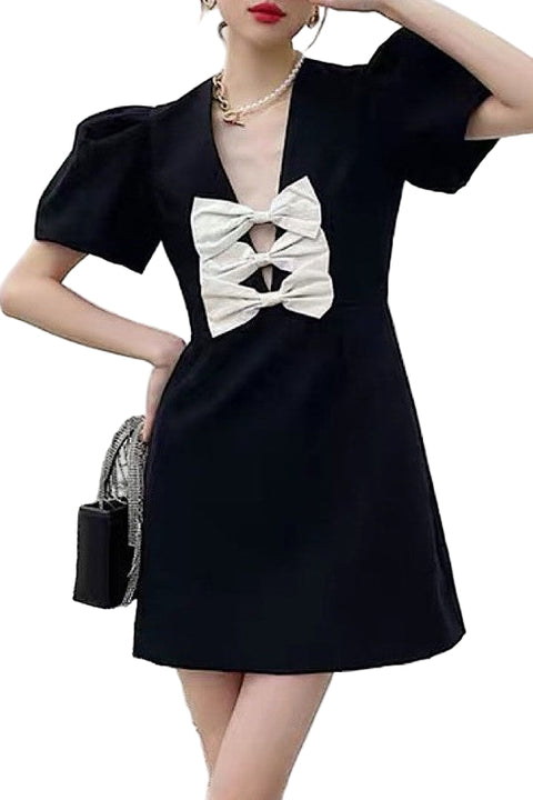 This black puff sleeve dress features charming cream bows that add a playful touch to its elegant silhouette. Perfect for lively occasions or casual outings, it blends classic style with a fun, flirty vibe. The delicate bows bring a sweet contrast, making this dress a delightful wardrobe staple that’s both stylish and spirited.