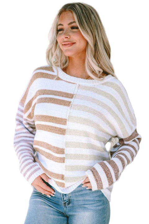 Get cozy in this Stripe Blocked Drop Shoulder Slouchy Sweater, where khaki meets cream in a fun, laid-back style. Its relaxed fit and soft fabric make it perfect for those days when comfort is key, but you still want to look effortlessly cool. Slip it on, slouch a little, and enjoy the easygoing vibes!