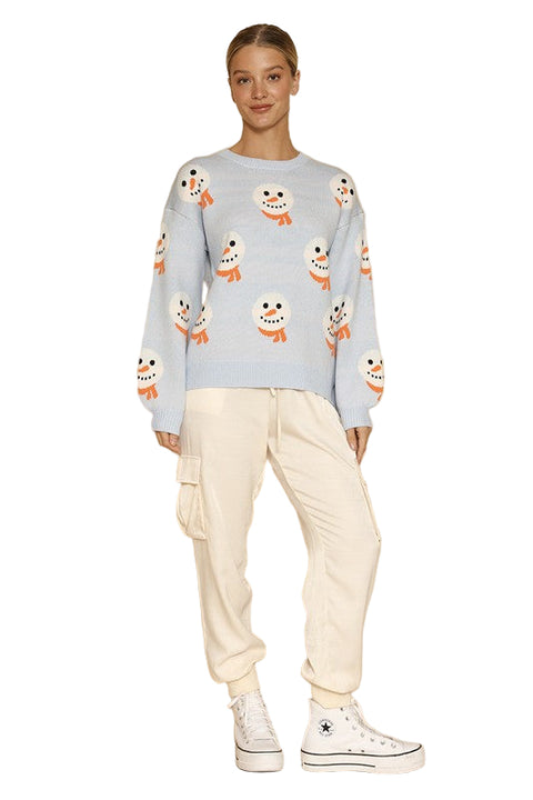 Cozy up in frosty fun with this Snowman Knit Sweater in a cheerful light blue! Perfect for bringing a splash of winter whimsy to your wardrobe, its soft knit keeps you warm while the playful snowman design sparks smiles wherever you go. Ideal for chilly days filled with holiday cheer or casual winter outings.