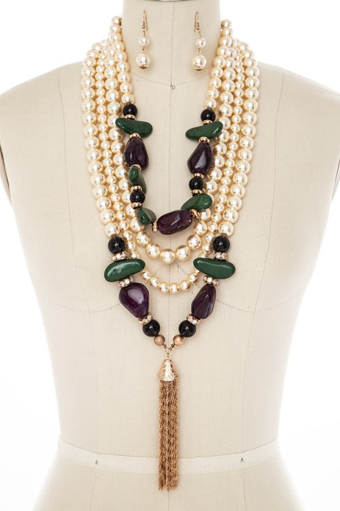 Stone & Chain Tassel Layer Pearl Necklace Set