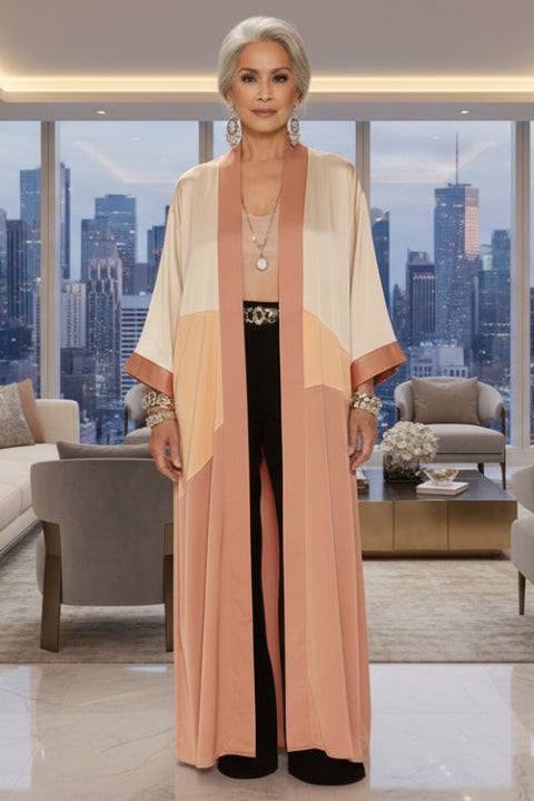 An elegant maxi kimono featuring our signature sunset color-block design, crafted from luxuriously textured satin. Graceful side slits enhance movement and silhouette. Note that this piece runs generously sized, allowing for a relaxed, flowing fit that complements the kimono's sophisticated aesthetic.