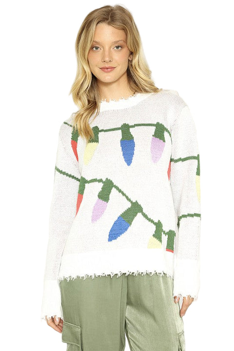 Get festive in this cheerful white Christmas Light Sweater, sparkling with colorful lights that bring holiday joy to life. Perfect for spreading merry vibes at any gathering, it’s a fun and bright way to light up the season and keep spirits high.